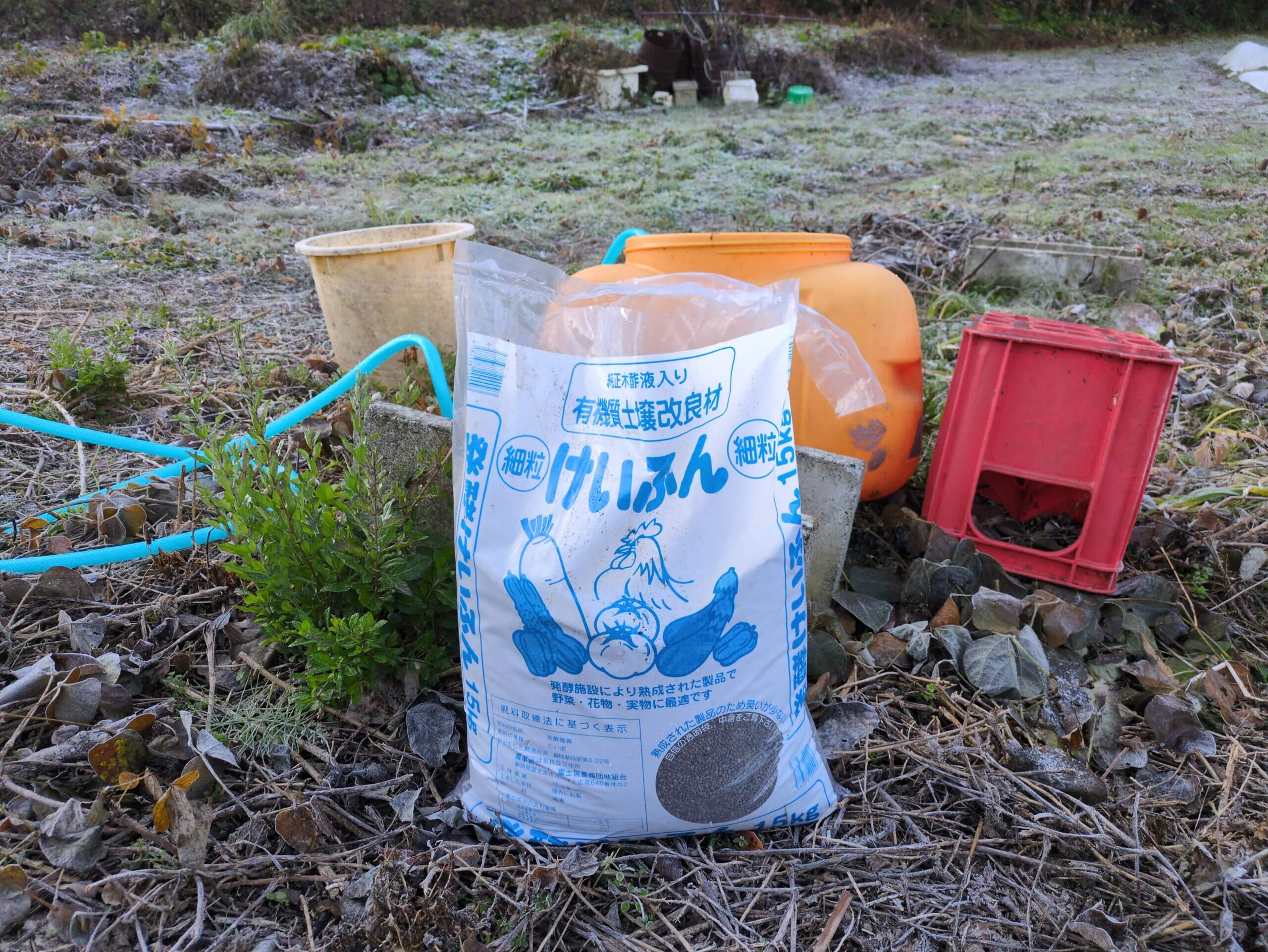 本日の計画 けいふんのある程度そのまま散布できるところはそのまま散布して 液肥をした上で散布せざるを得ない箇所も多いので 液の準備をして明日散布したいなと思っています その他は引き続き畑全体のお掃除 木の伐採がメインですかね 以上です