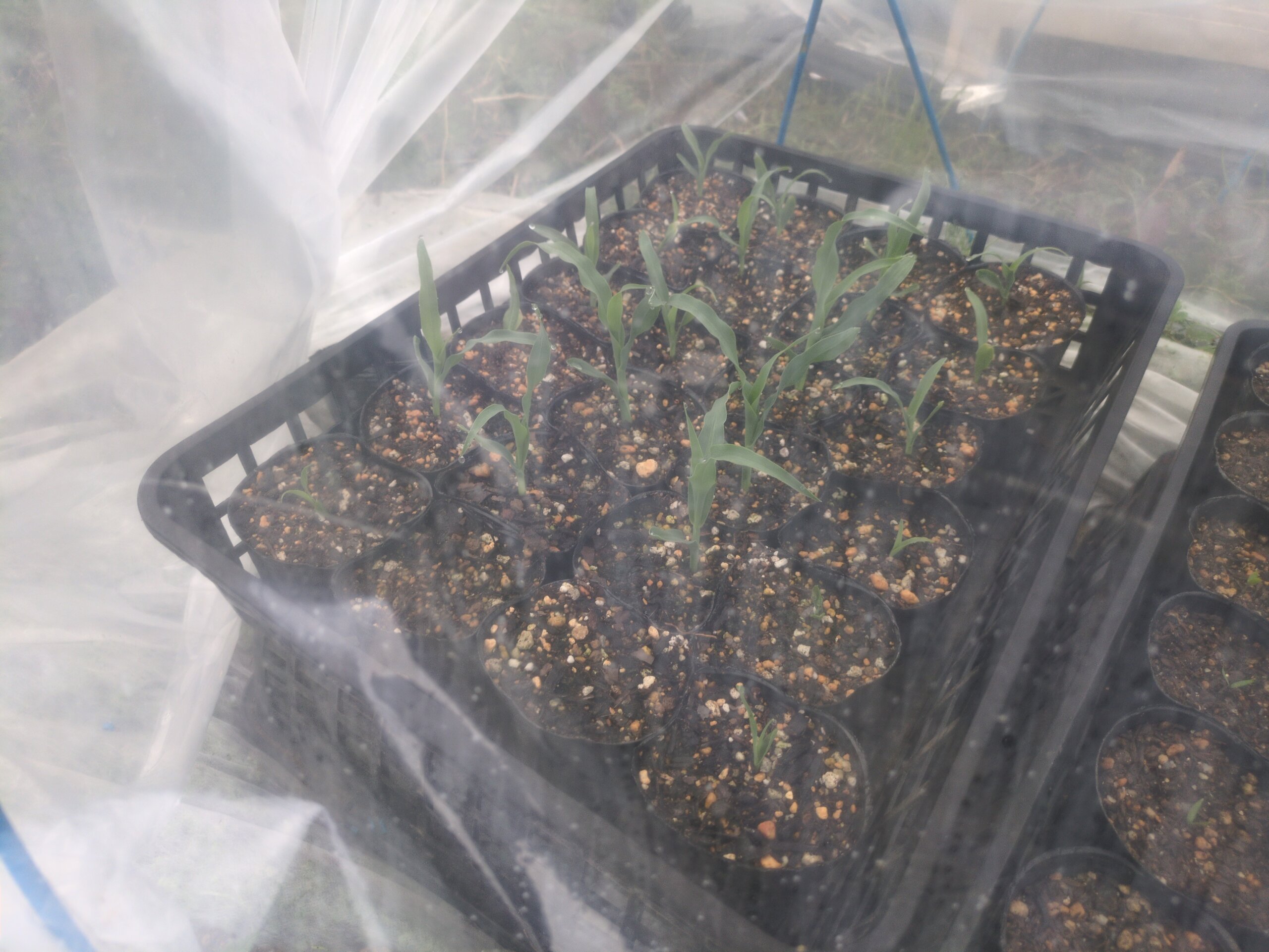 トウモロコシの苗が定植可能なサイズに達しているか確認し、定植作業を実施