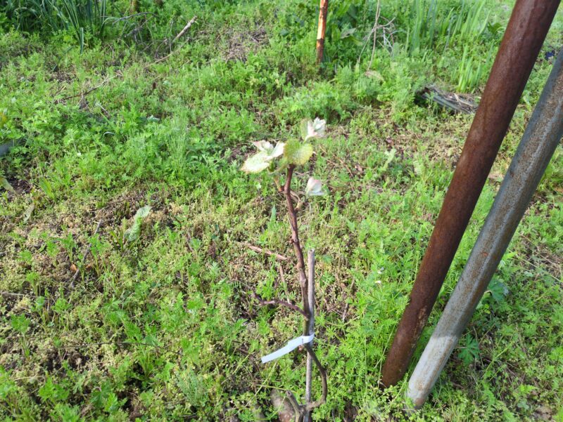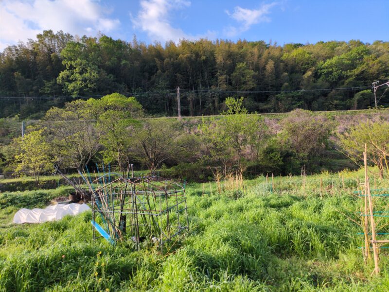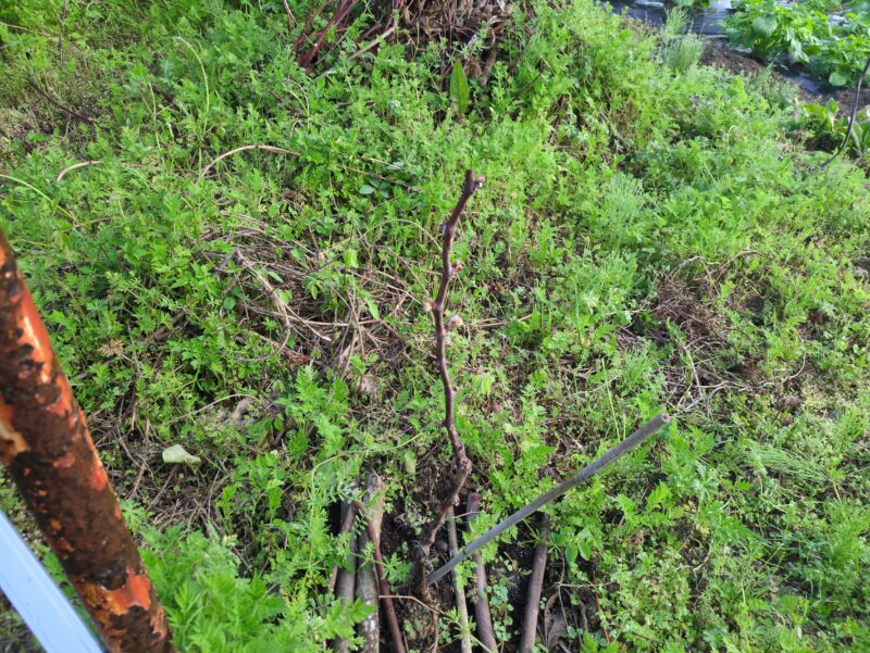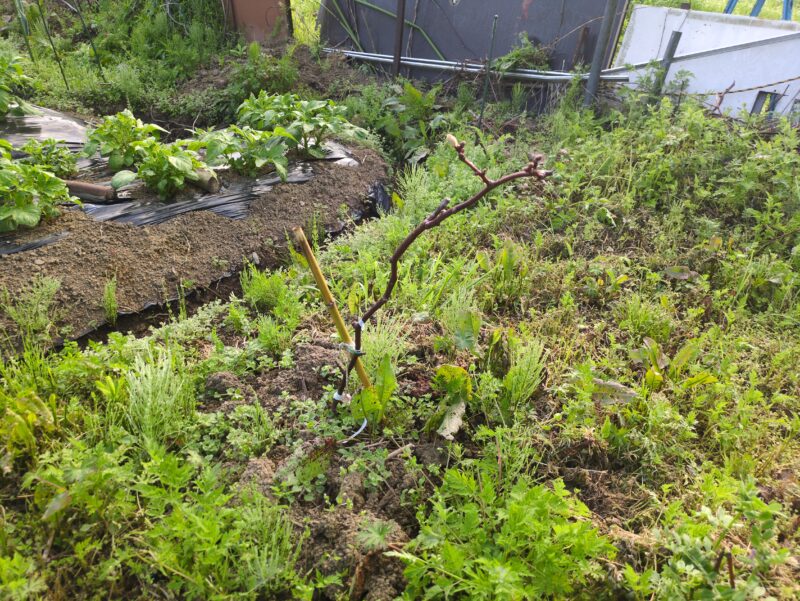 ソルゴーを試しに一条播種。スイカ接木苗2株を行灯で定植。ぶどうやキウイなども動き始めており安心。